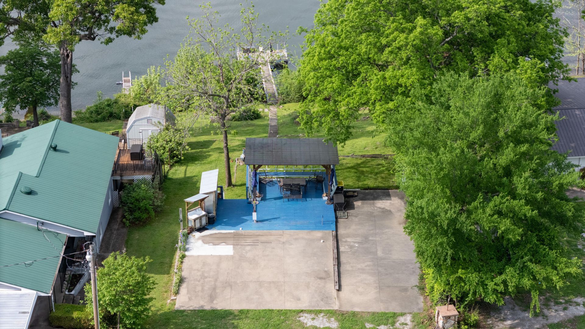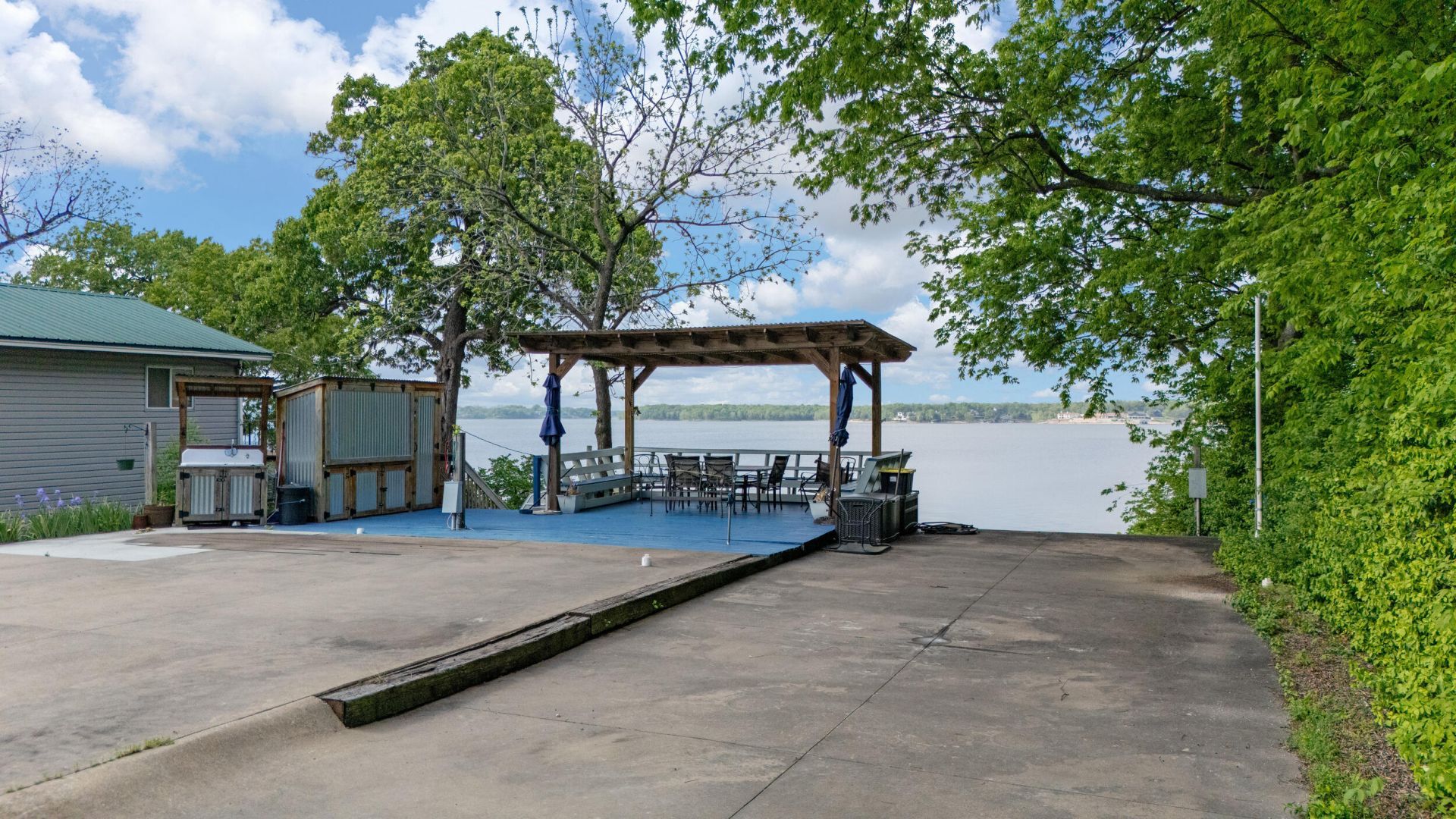 Views, Views and more Views. This lakefront lot has a view to die for! Build the home of your dreams or park your camper and take it all in. Currently has a concrete pad with sewer stations, water hook ups and electric for 3 trailers or motorhomes. Nice covered area for relaxing, a concession area equipped for cooking, storage area for fishing poles or floaties, potential business opportunity. Not many of these left!